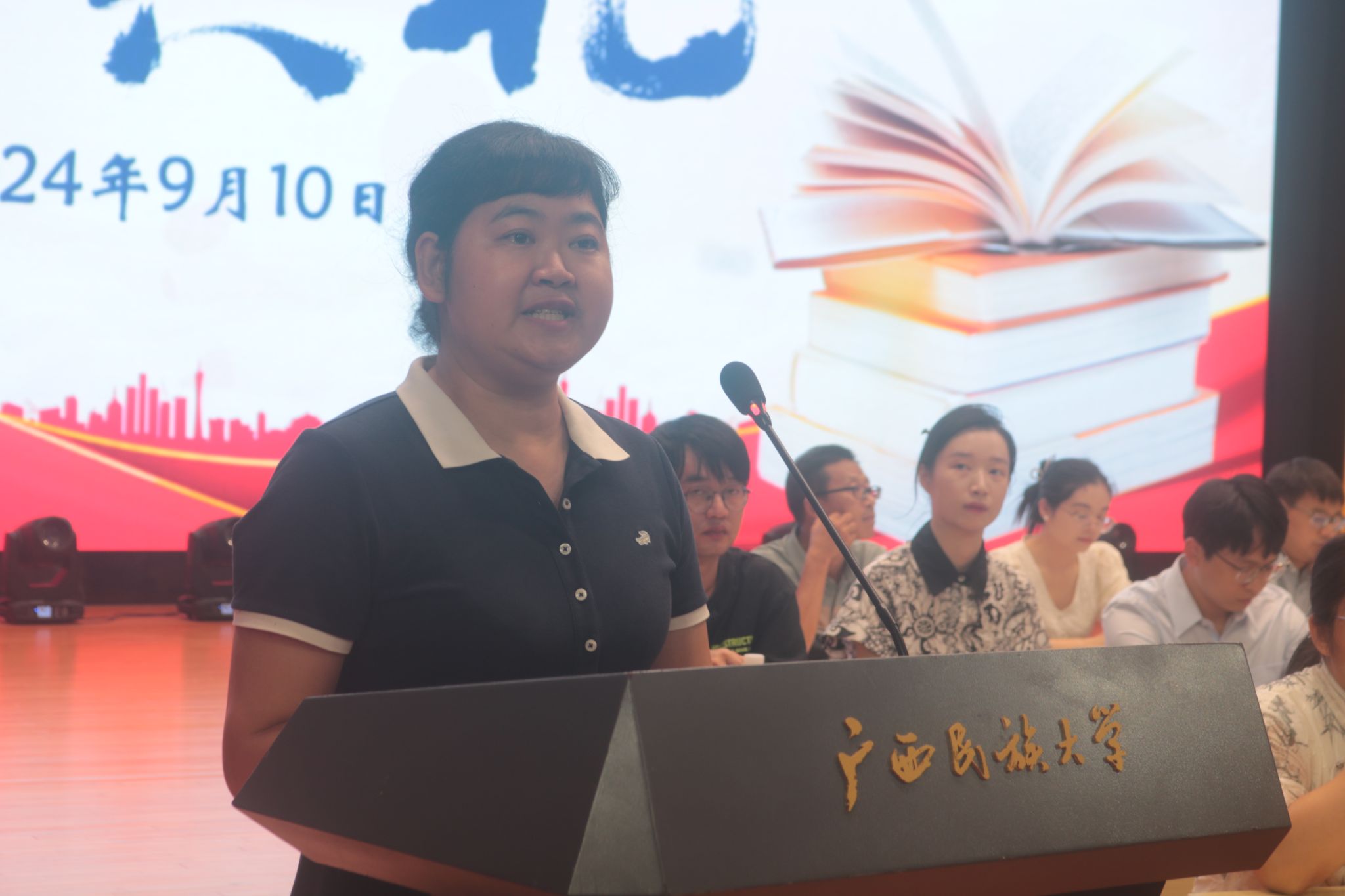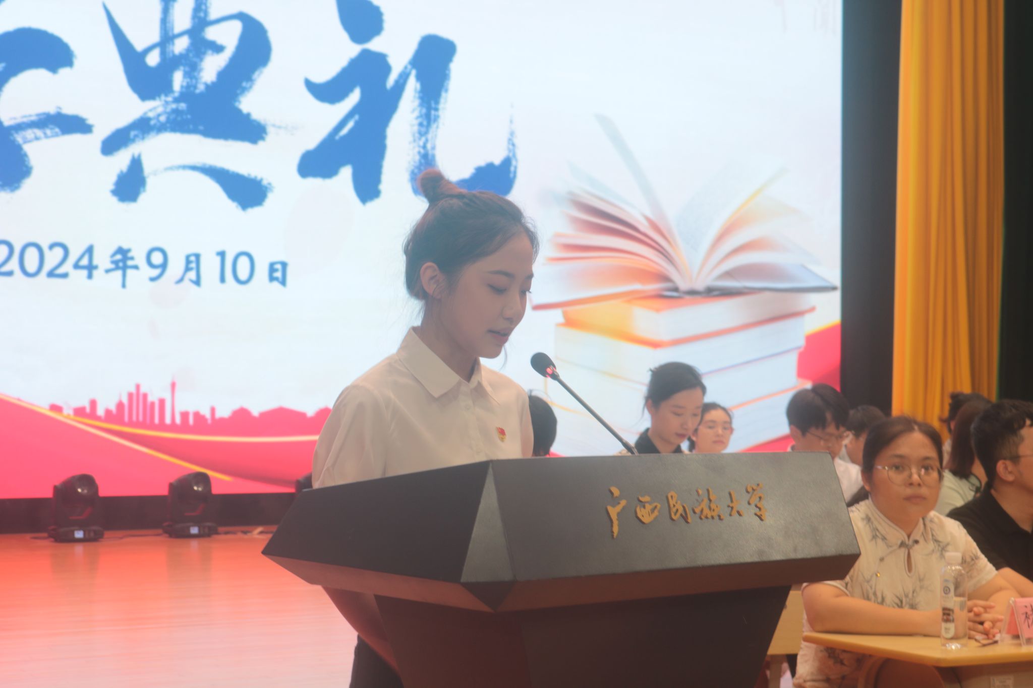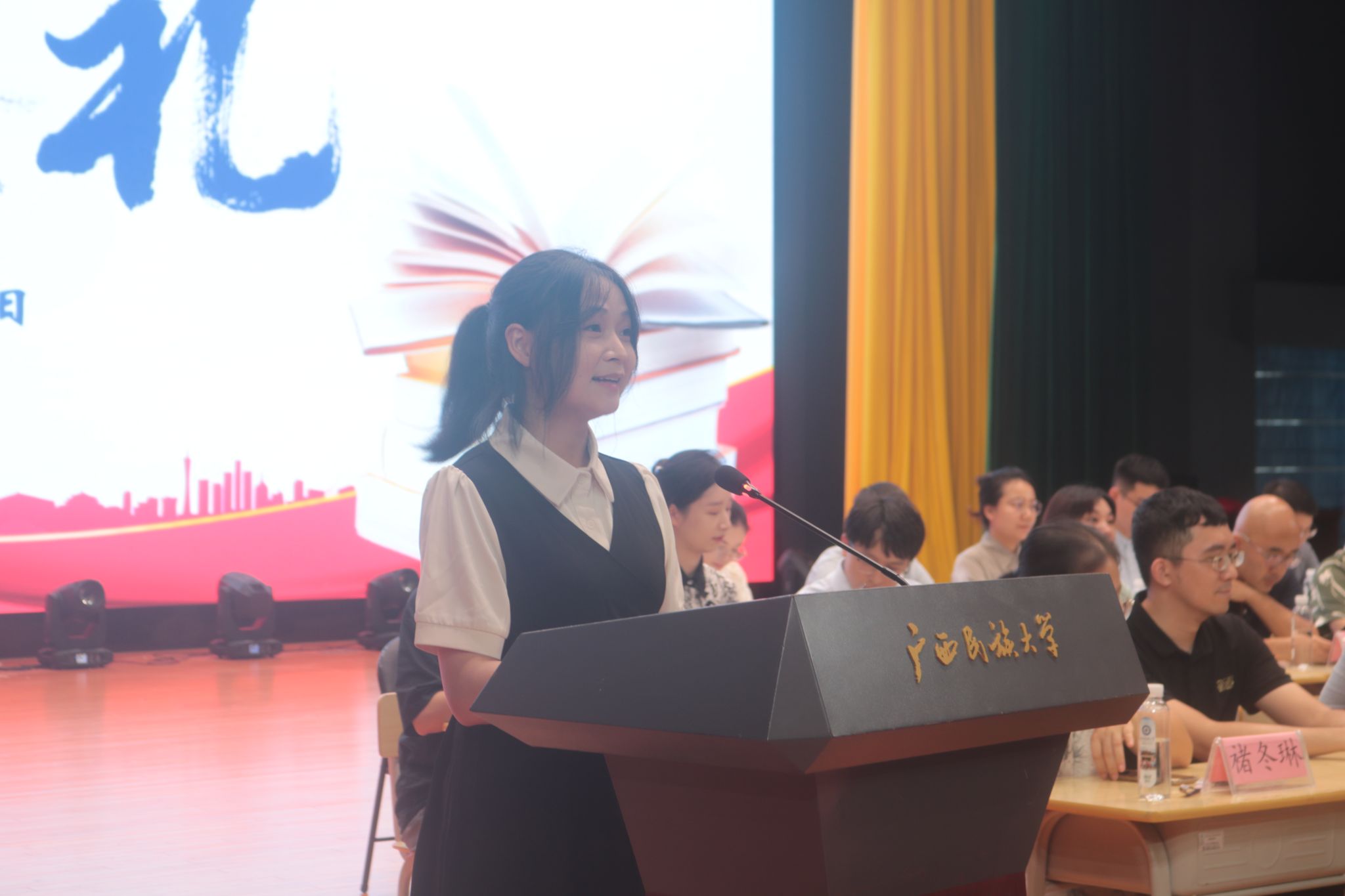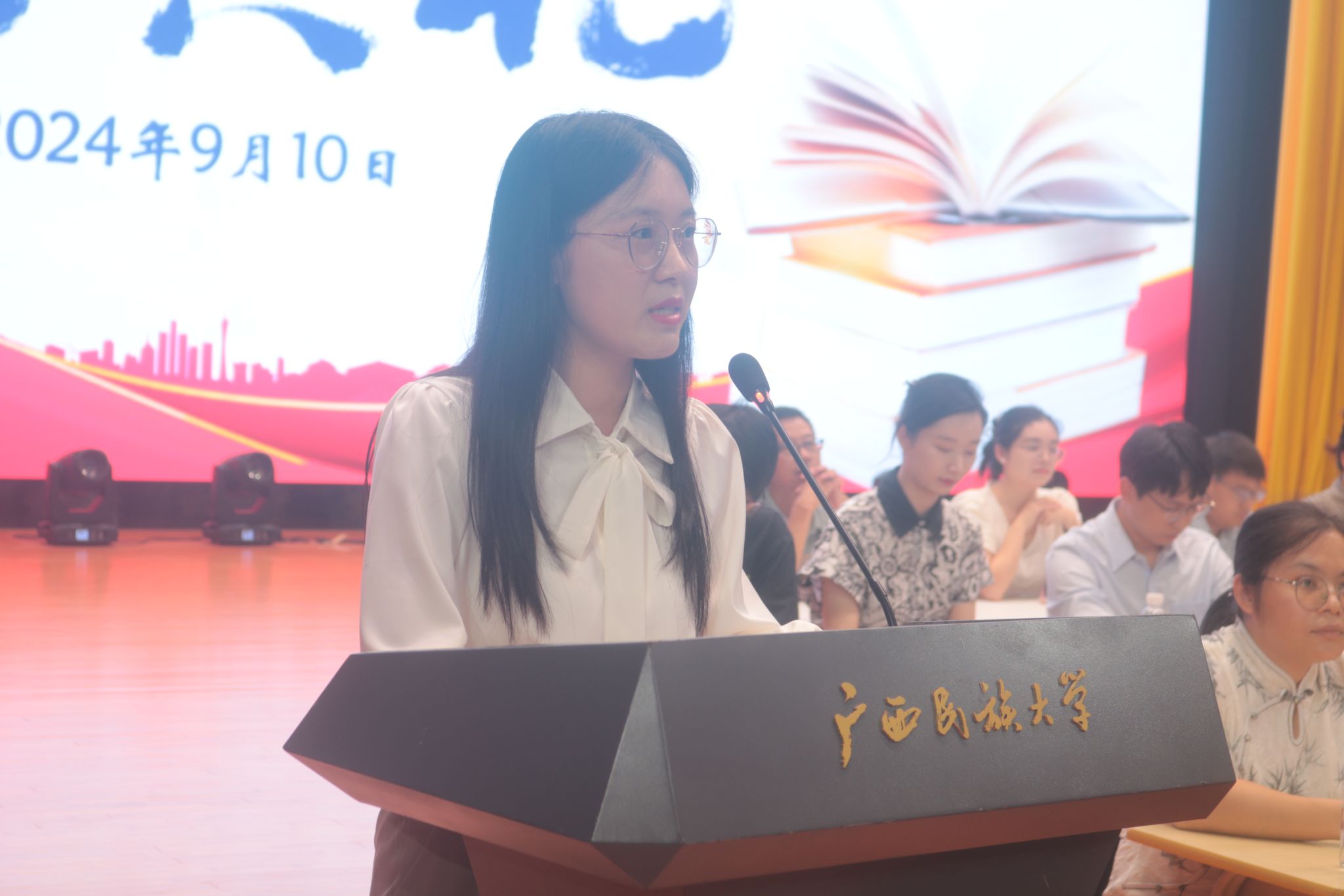 在发言环节中,教师代表陈敏娟、潘昱,辅导员代表黎靖、本科新生代表2024级国际经济与贸易2班甘艳玲、研究生新生代表2024级金融学专业陈蕾竹、本科老生代表2021级国际经济与贸易2班范家文、研究生老生代表2022级国商国际商务1班胡弟海纷纷上台,分享了各自的心路历程与感悟。他们从不同角度阐述了老员工的理想状态:志存高远,积极生活。大学是全新起点,唯有不懈奋斗,方能铸就精彩篇章。