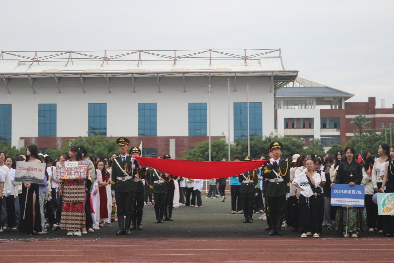 伴随着昂扬的进行曲,国旗队、院旗队踏着铿锵有力的步伐入场。随之而来的是裁判员方阵、职工方阵、各班方阵。他们以丰富多彩的队形表演展示了老员工青春活力的模样。升旗仪式后,运动员代表2024级国际经济与贸易2班黄福秀、裁判员代表2024级国际经济与贸易1班陆洁媚上台发言宣誓。本次院运会在胡超宣布开幕中正式拉开帷幕。