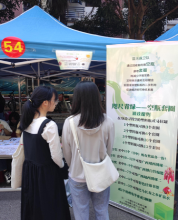 “蓝天保卫队”在美狮贵宾会思源湖田径场周边的摊位上设立了专门的回收点,积极倡导师生将用过的塑料瓶带至摊位进行回收,并参与其中的套圈游戏。游戏中,参与者有机会通过套圈赢取绣球、竹编篮、龟苓膏等多种奖品。团队巧妙地将环保行动与壮族文化特色相结合,创新性地推广了壮族文化的传播方式,同时激励更多人投身于环保事业,深入认识壮族的独特文化。