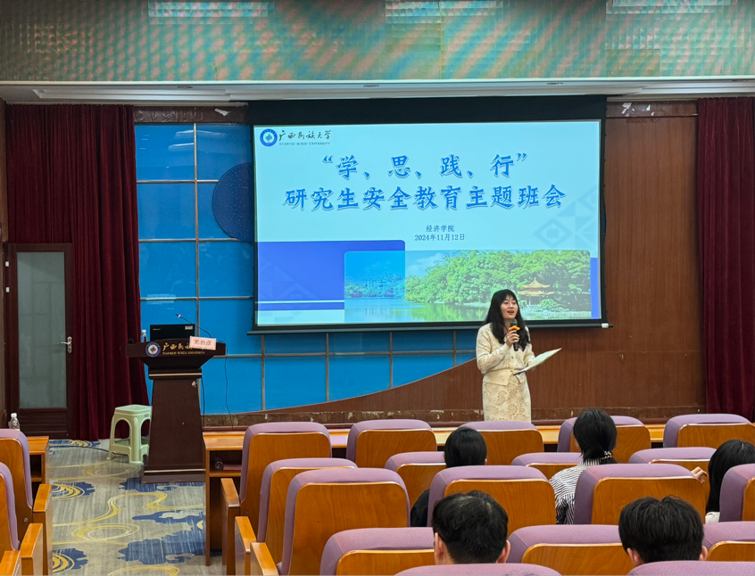 2024年11月12日下午,美狮贵宾会开展了期中安全教育主题班会。本次主题班会由辅导员邱雯霞主讲,美狮贵宾会2024级研究生参加。